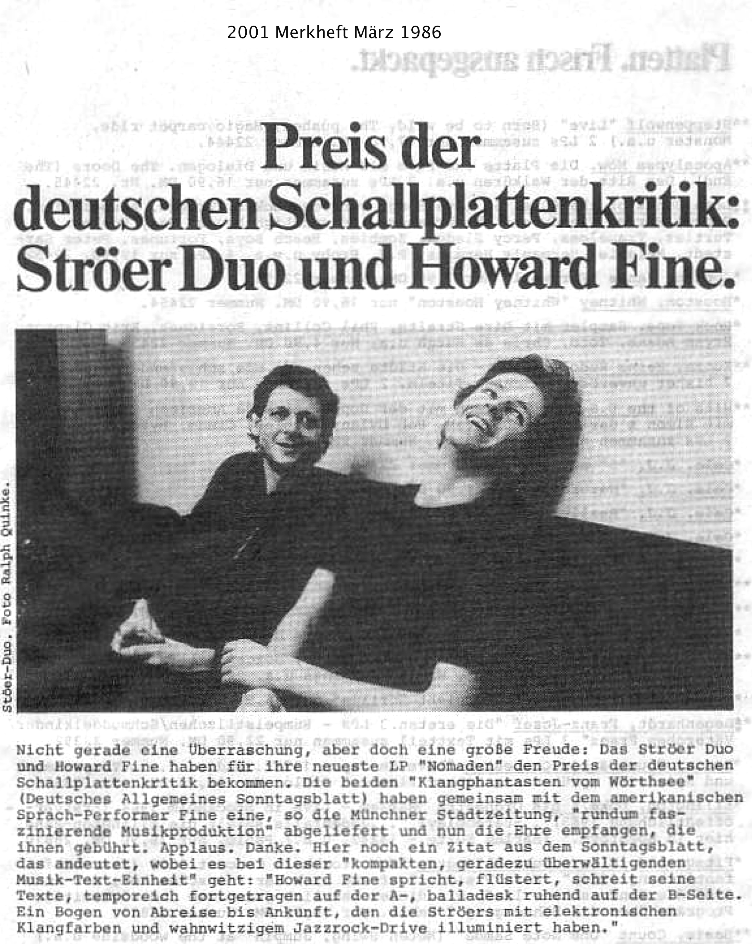 1985 Preis der deutschen Schallplattenkritik für das Album „Nomaden“ mit Ernst Ströer und Howard Fine