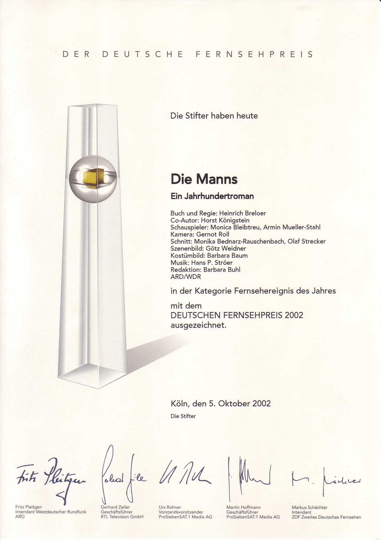 2002 Deutscher Fernsehpreis für die Filmmusik zu "Die Manns - ein Jahrhundertroman" (Fernsehereignis des Jahres)