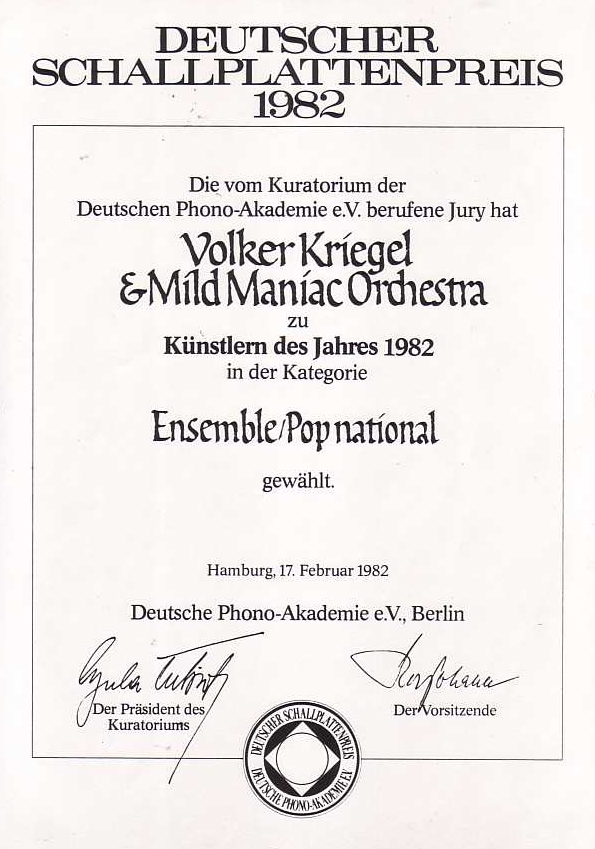 1982 Deutscher Schallplattenpreis Ensemble Pop/National mit Volker Kriegels Mild Maniac Orchestra